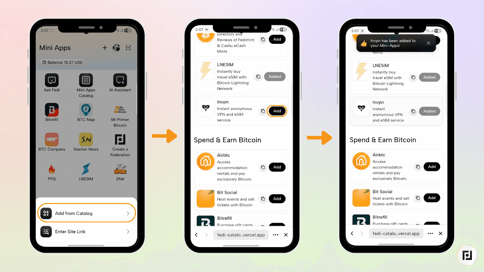 Com «Adicionar do Catálogo», podes navegar pelo Catálogo de Mini Apps da Fedi e clicar no botão «Adicionar» ao lado da Mini App que quiseres. Usa a barra de pesquisa na parte de cima para procurar o MoneyBadger e clica no botão «Adicionar». Isso adiciona automaticamente a Mini App MoneyBadger às tuas Mini Apps pessoais.