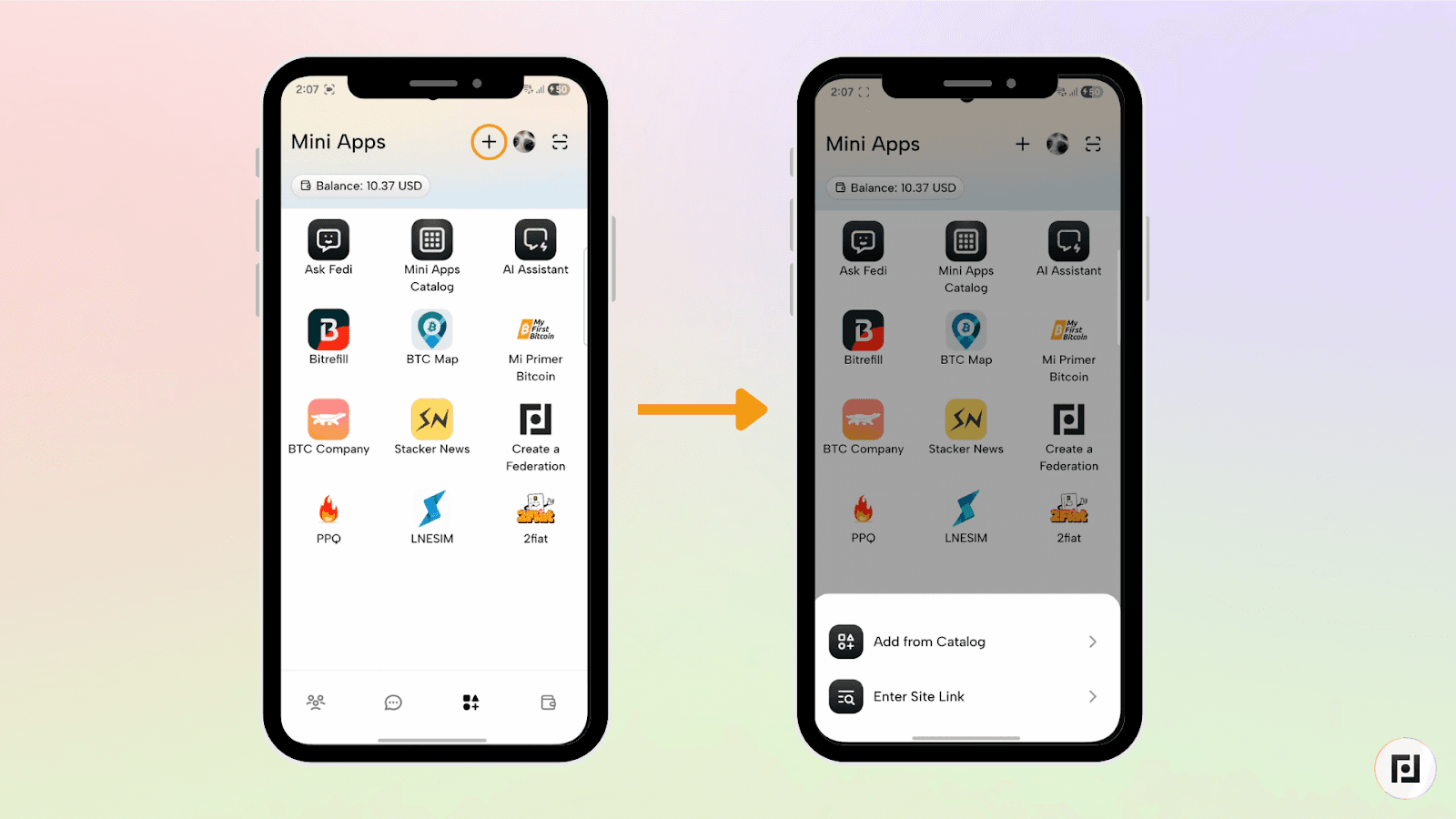 Passo 1: Abre a Mini App MoneyBadger no Fedi: clica no botão Mini App no canto inferior direito do ecrã e, em seguida, clica na Mini App MoneyBadger que acabaste de adicionar.